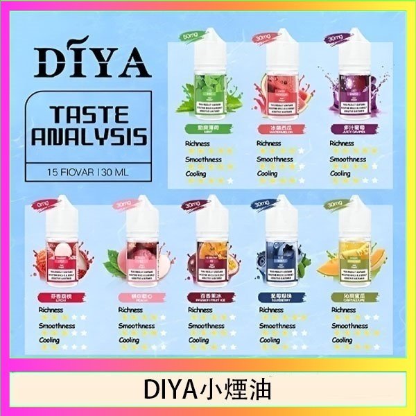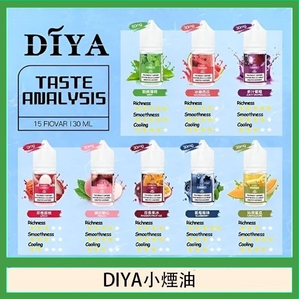 DIYA叮啞全新推出 15 種口味小煙油,0-50MG 尼古丁鹽濃度選擇,滿足不同需求。